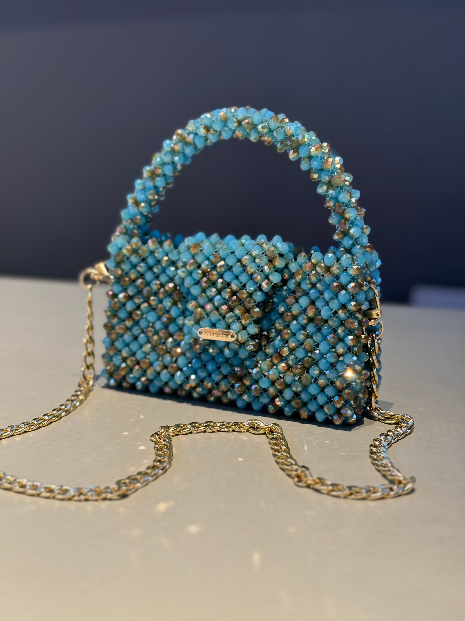 Descubre la joya que elevará tus outfits a otro nivel. Este bolso, hecho a mano con cuentas de cristal aguamarina y beige, deslumbra con su brillo sofisticado y su diseño exclusivo. Su cadena dorada ajustable te permite llevarlo como más te guste: cruzado, al hombro o tipo clutch.