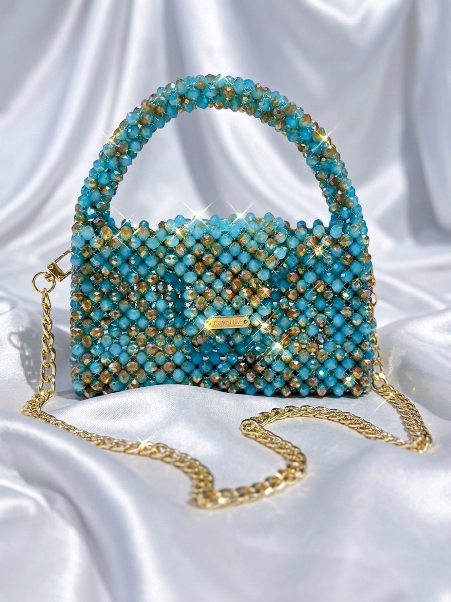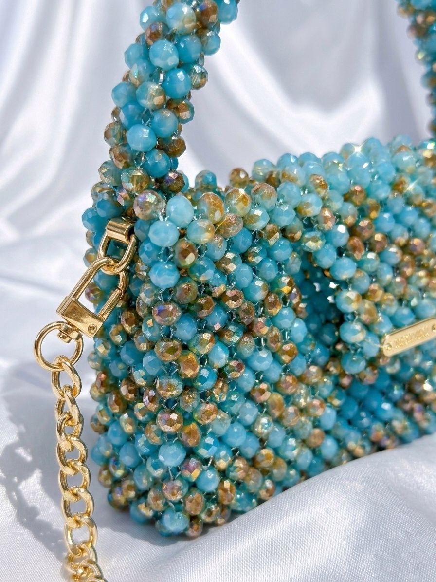 Un accesorio que captura todas las miradas. Este bolso está elaborado con delicados cristales turquesa y beige que reflejan la luz con un brillo sofisticado y elegante, convirtiéndolo en la pieza perfecta para eventos especiales, cenas o noches inolvidables.