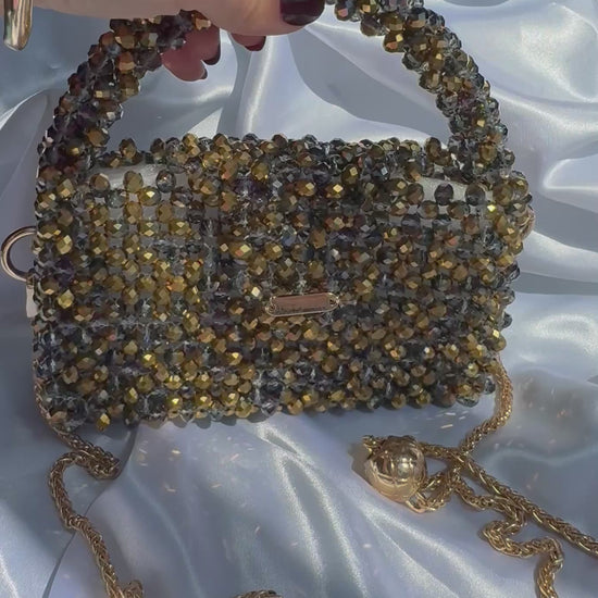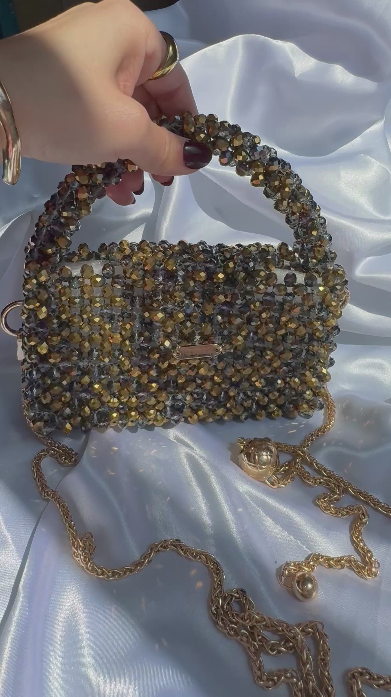 Descubre la joya que elevará tus outfits a otro nivel. Este bolso, hecho a mano con cuentas de cristal doradas, deslumbra con su brillo sofisticado y su diseño exclusivo. Su cadena dorada ajustable te permite llevarlo como más te guste: cruzado, al hombro o tipo clutch.